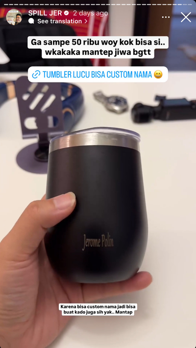 “Ya ada yang sama sama tumbler nya, ini free custom name ya, jadi aku tulis Jerome Polin, terus ini dari stainless steel jadi bisa dingin bisa panas, ada tutupnya juga kayak gini, terus ini cukup gede sih, tapi bisa dibawa ke mana-mana, harganya cuma Rp50 ribu mantap jiwa, aku beli di Shopee, ini linknya” kata Jerome.