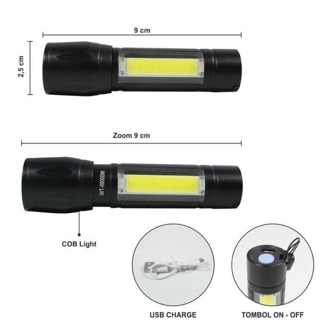 Senter Mini XPE COB Led Zoom SWAT Police Light Recharge