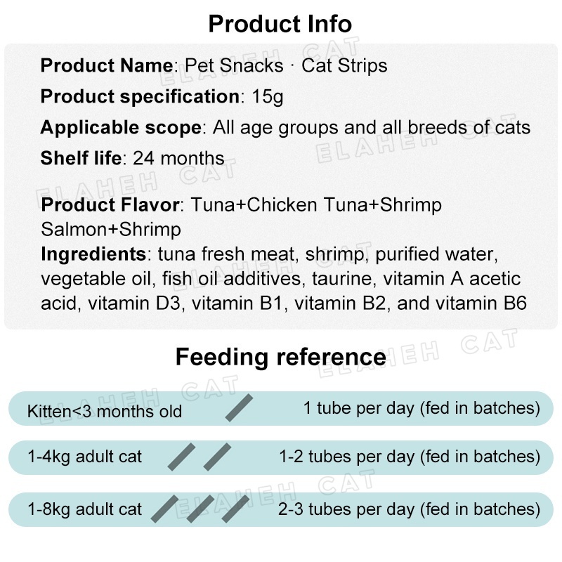 Protein ≥ 8%, lemak kasar ≥ 1%, serat kasar ≤ 2%, abu kasar ≤ 1%, taurin ≥ 0,1%, kelembaban ≤ 80