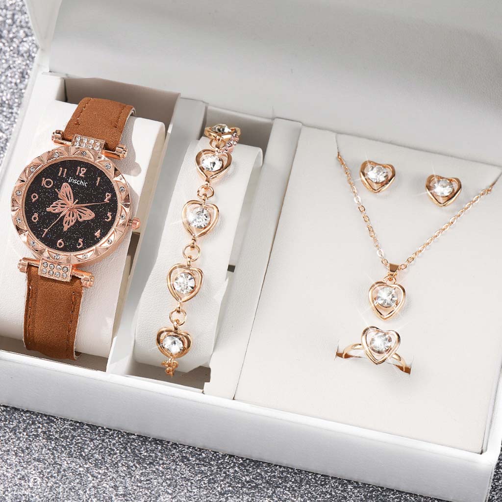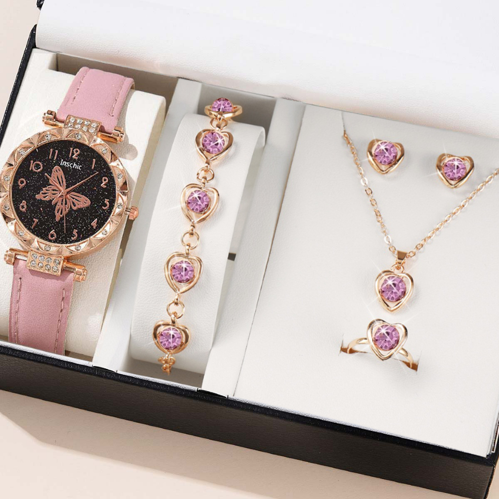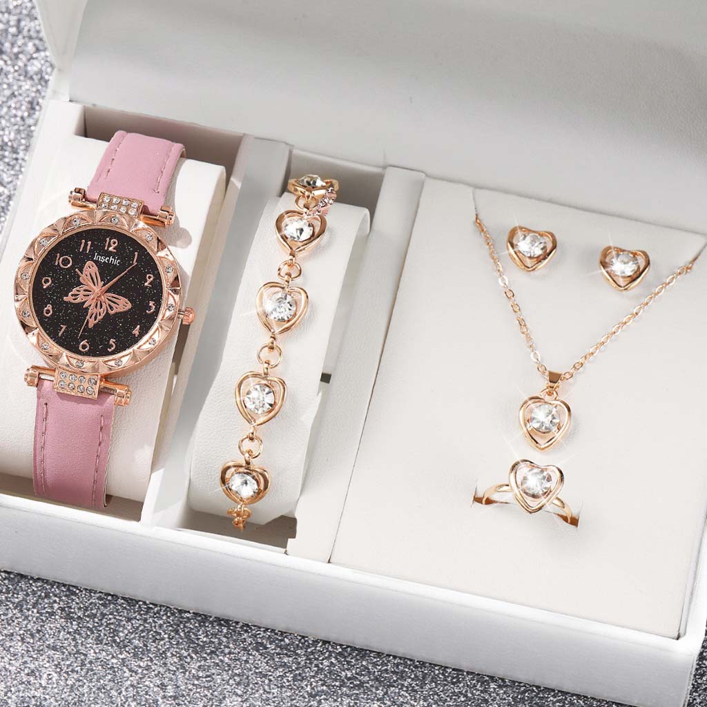 6 Pcs Jam Tangan Kuarsa Kupu-Kupu Wanita Dengan Aksesoris Fashion Mutiara Jam Tangan Sabuk Wanita Baru