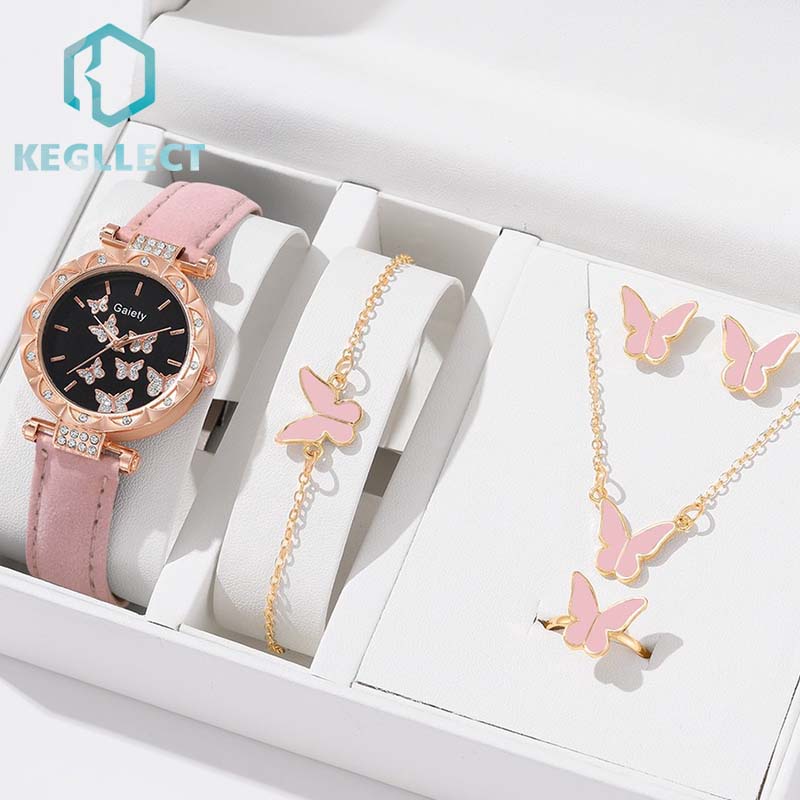 6 Pcs Mewah Perhiasan Wanita Cincin Kalung Anting Gelang Set Jam Tangan Kupu-kupu Tali Kulit Wanita Kuarsa Jam Tangan Tidak Ada Kotak