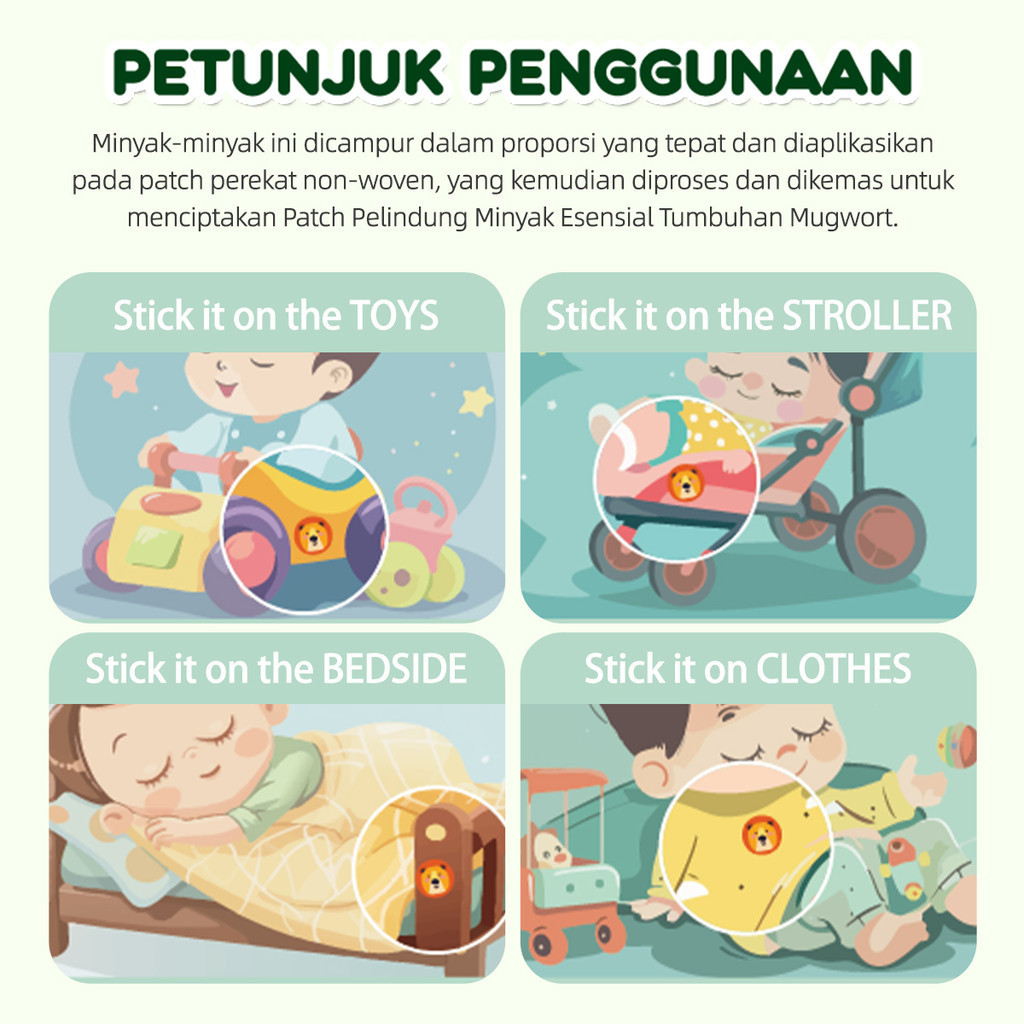 Tempelkan pada pakaian, tempat tidur bayi, atau area yang sesuai.