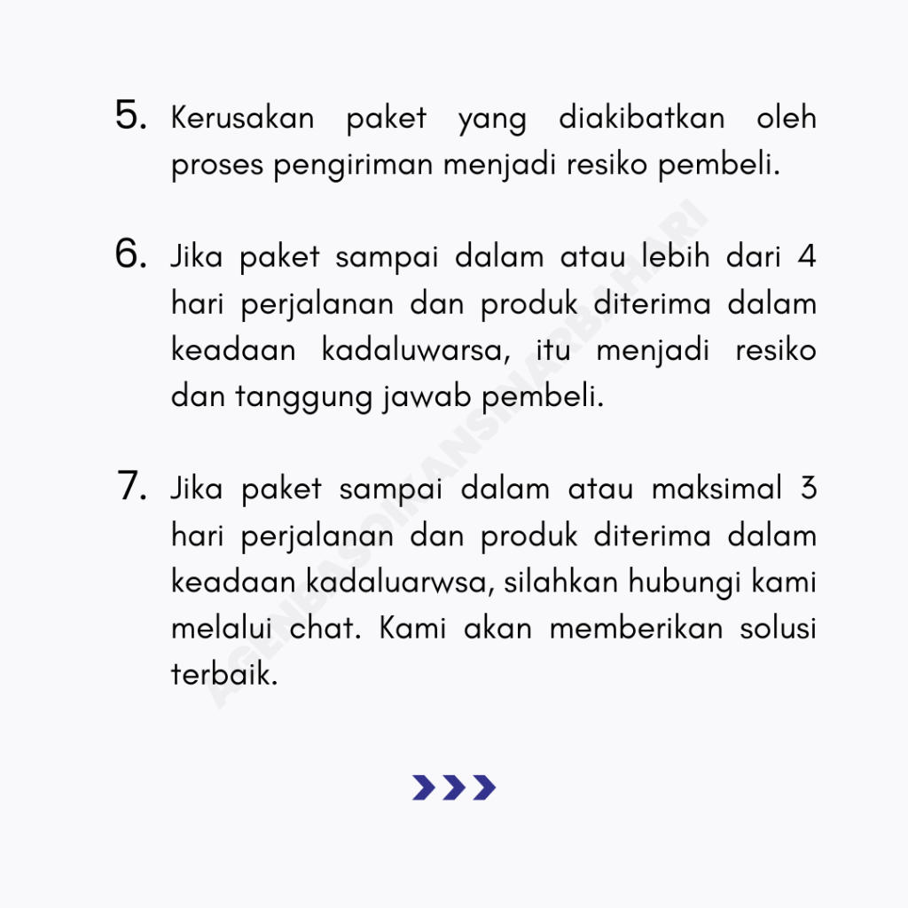 6. Jika pesanan sampai dalam atau lebih dari 4 hari perjalanan dan produk diterima dalam keadaan kadaluwarsa, itu menjadi resiko dan tanggung jawab pembeli.