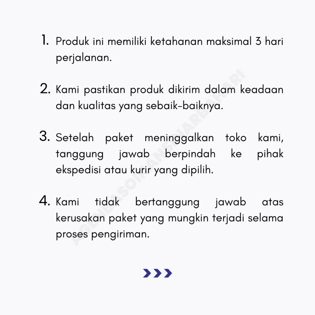 1. Produk ini memiliki ketahanan maksimal 3 hari perjalanan.
