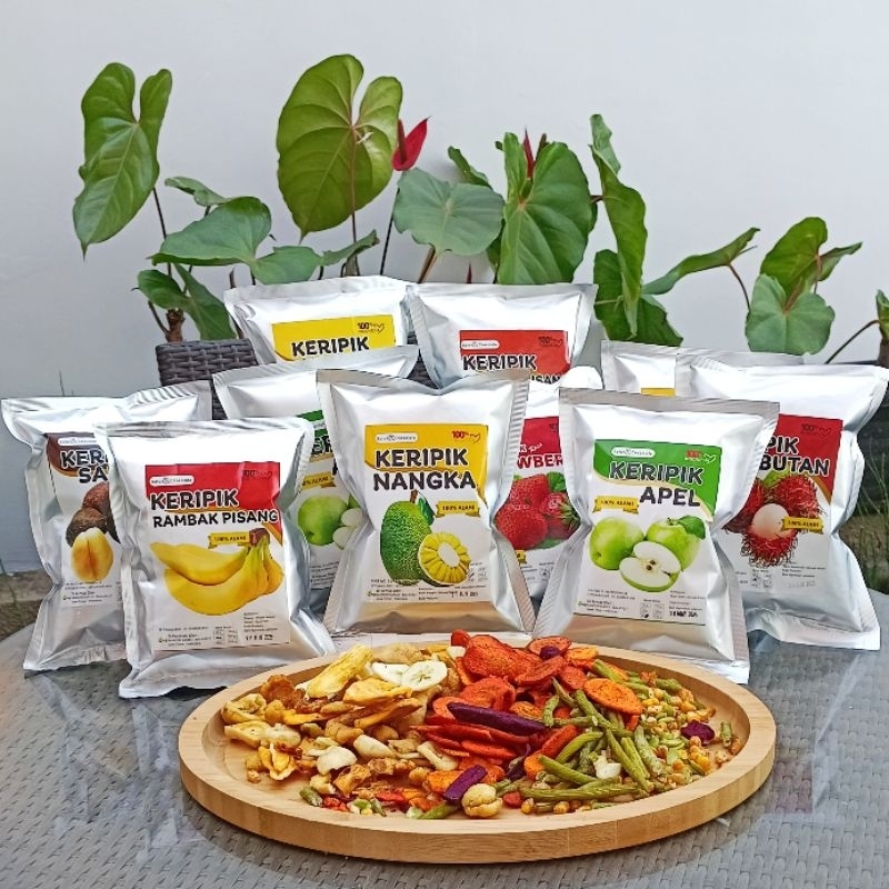 Keripik buah Apel, Nangka, Mangga, Rambutan, Salak, Nanas, Tape menggunakan 100% BUAH ALAMI tanpa pemanis buatan, tanpa pewarna buatan, tanpacampuran tepung diolah menggunakan mesin vacum friying dengan tekanan panas yang rendah sehingga terjaga rasa dan kandungan vitaminnya, teksturnya pun tetap renyah.