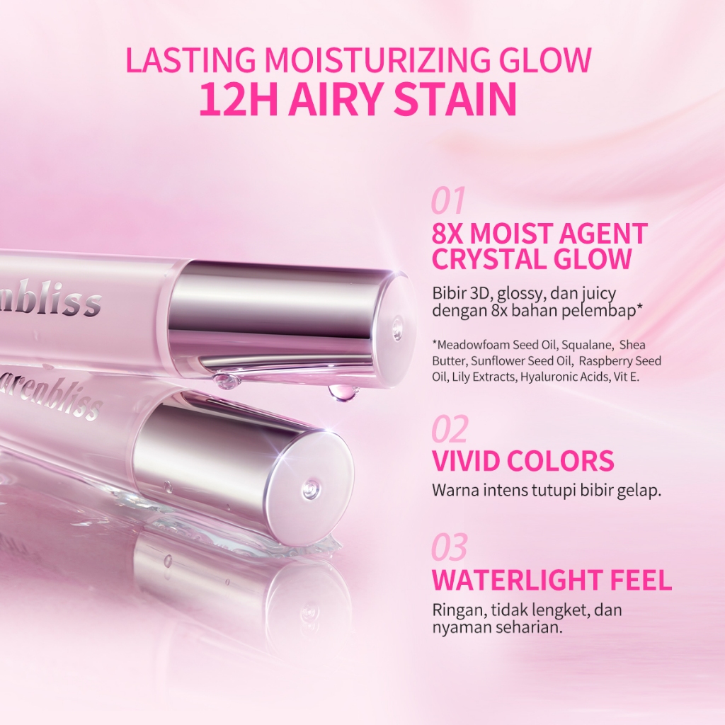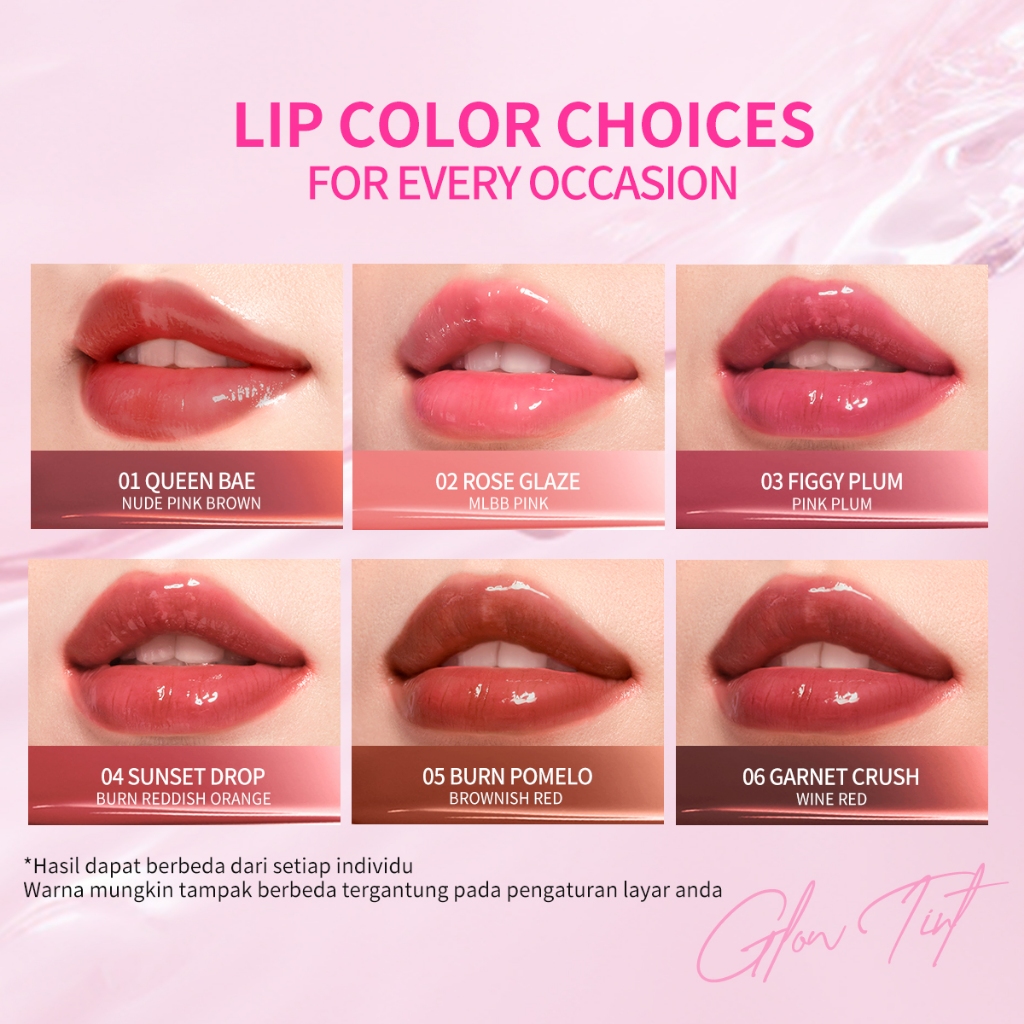 Glow tint yang diformulasikan dengan 8 moisturizing agents yangbekerja sinergis untuk membantu melembapkan bibir dengan hasil stain ringan bercahaya selama 12 jam untuk tampilan bibir sehat dan berkilau.