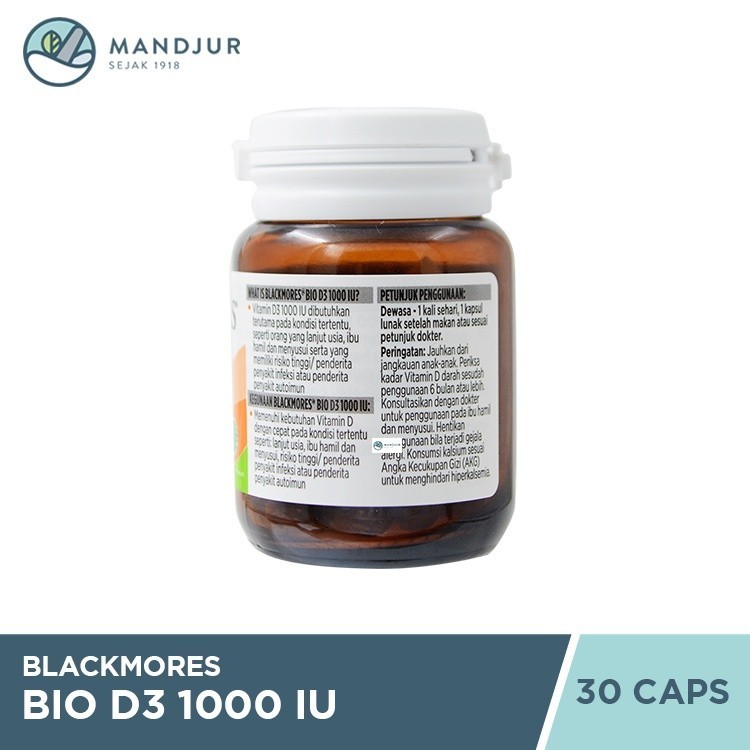 Blackmores Bio D3 1000 IU merupakan suplemen kesehatan yang berfungsi untuk membantu memenuhi kebutuhan Vitamin D harian dengan cepat pada kondisi tertentu seperti : lanjut usia, ibu hamil dan menyusui, resiko tinggi / penderita infeksi atau penderita autoimun.