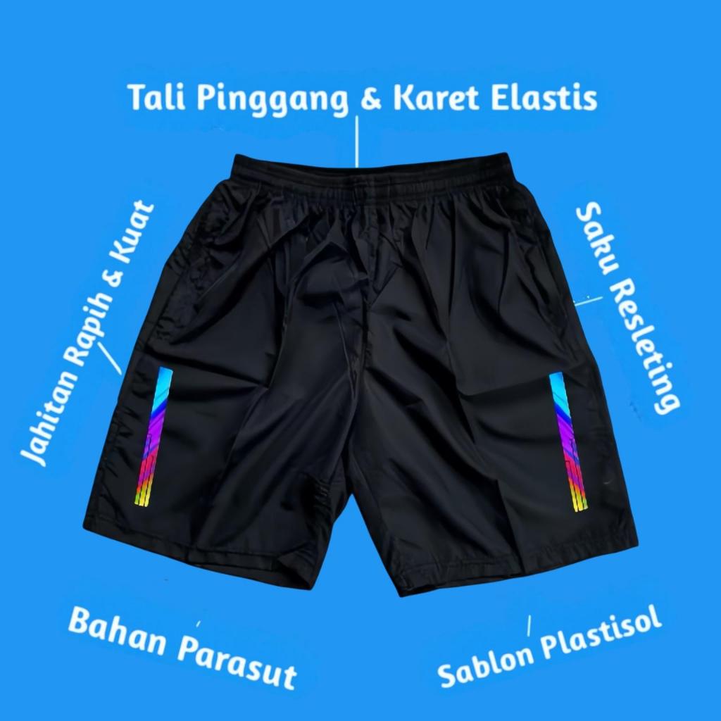 Celana ini berbahan Parasut Micro yang sangat nyaman dan ringan saat digunakan. Keunggulan lain dari bahan parasut yaitu tidak tembus oleh air. celana pendek parasut ini dipadukan dengan sablon plastisol yg sudah tidak di ragukan lagi daya rekatnya.