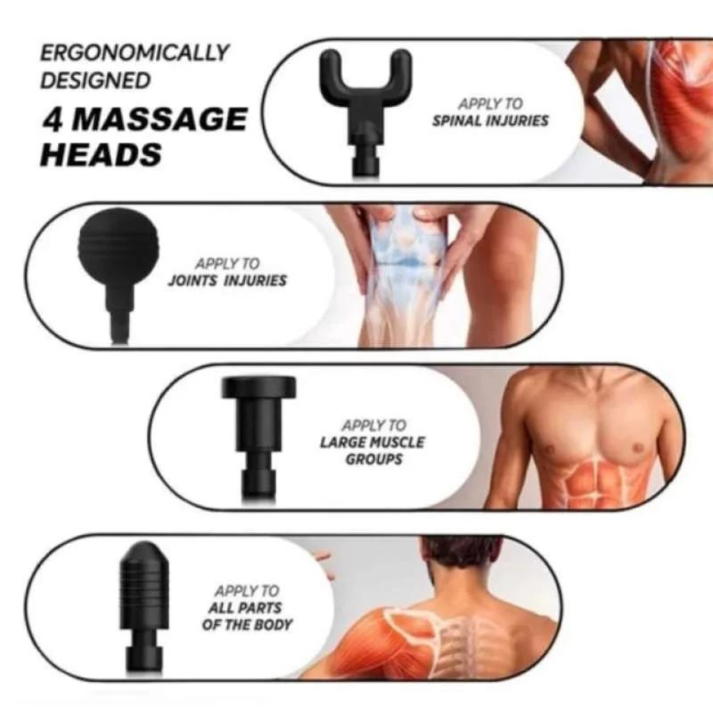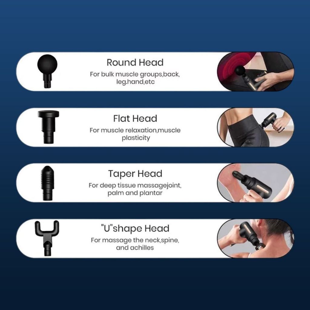 Bagian kepala massage gun ini dapat ditukar-tukar antara 4 kepala yang tersedia. Masing-masing kepala ini memiliki fungsi berbeda sehingga dapat Anda sesuaikan dengan area tubuh yang akan dipijat.