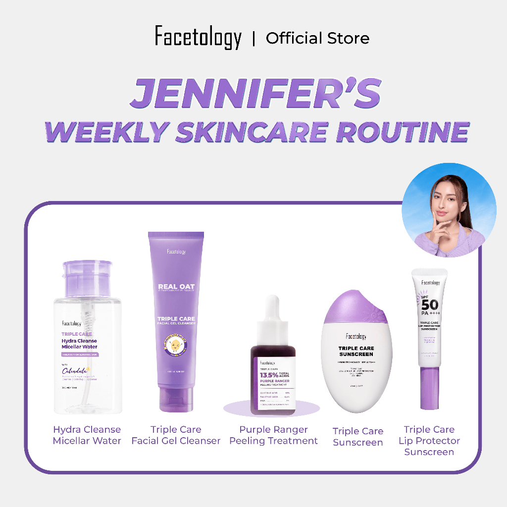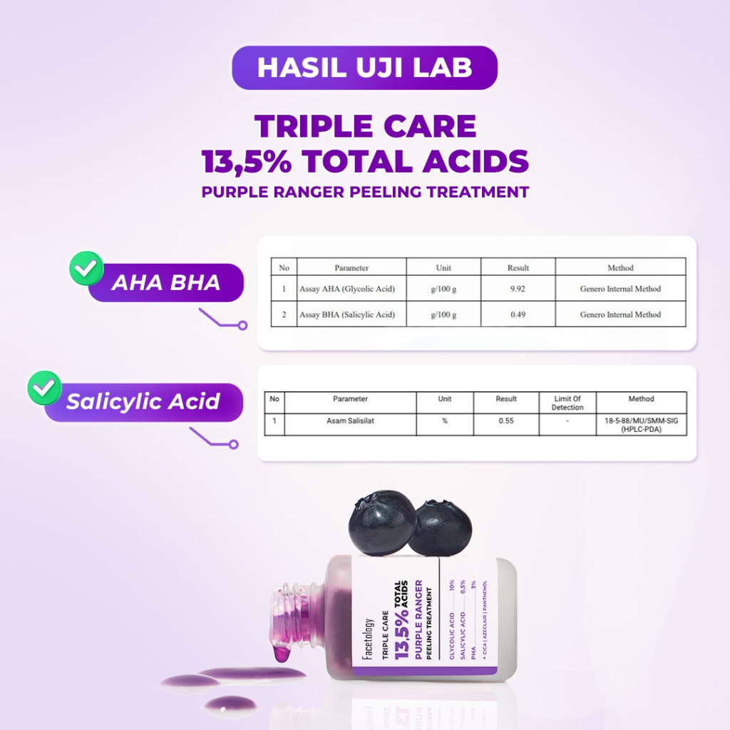 Facetology Triple Care 13.5% Total Acids Purple Ranger Peeling Treatment diformulasikan dengan 10% AHA (Glycolic Acid), 0.5% BHA dan 3% PHA yang berfungsi sebagai eksfoliator untuk meluruhkan sel kulit mati secara mendalam, membantu memudarkan bekas jerawat PIE & PIH. Diperkuat dengan kandungan Pure Cica 5% untuk membantu menenangkan kulit, Azeclair yang membantu mencerahkan, serta D-Panthenol yang berfungsi melembabkan kulit sehingga membuat permukaan wajah tampak lebih sehat, lembab dan cerah.