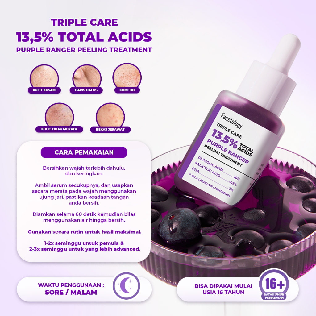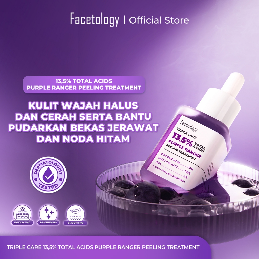FACETOLOGY Triple Care 13.5% Total Acids Purple Ranger Peeling Treatment Serum mengandung glycolic sebagai exfoliating bantu bersihkan wajah dan komedo