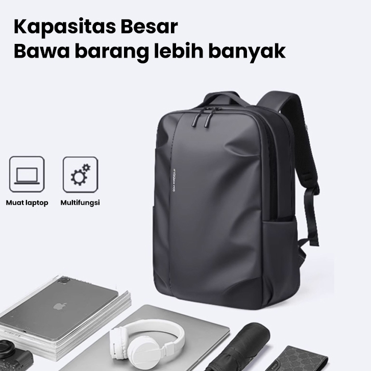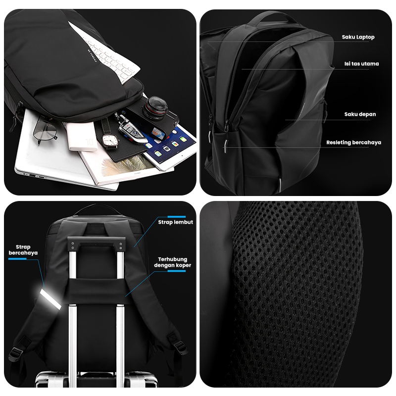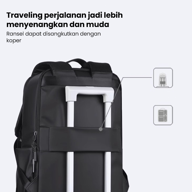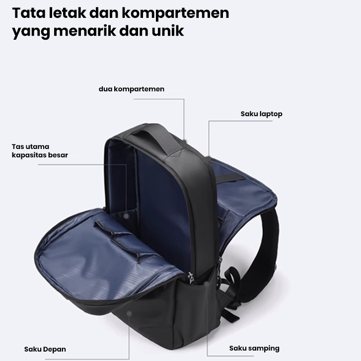 Tas ransel kasual berbahan Nilon yang memberi kesan elegant, pada kolom utama dilengkapi sekat untuk file dan bisa untuk membawa laptop max. 17.3 inch serta sekat organizer untuk menyimpan barang bawaan Anda agar tetap rapi. Tersedia kolom tambahan dibagian depan tas untuk menyimpan barang-barang yang sering diakses.