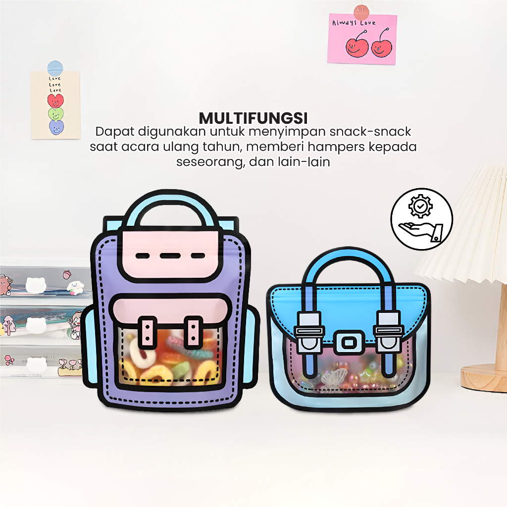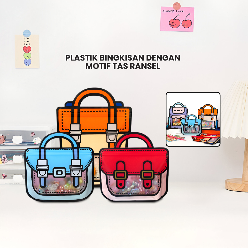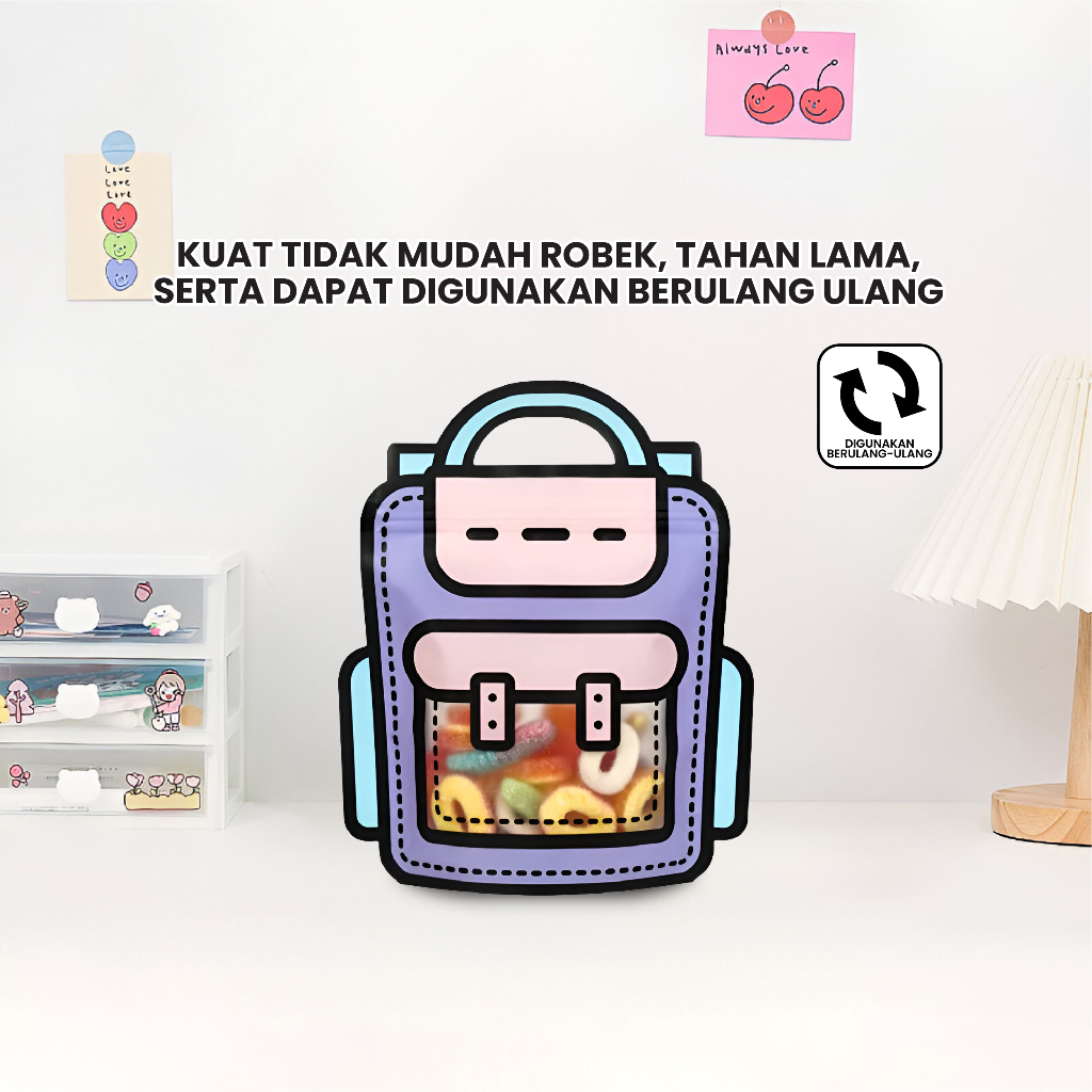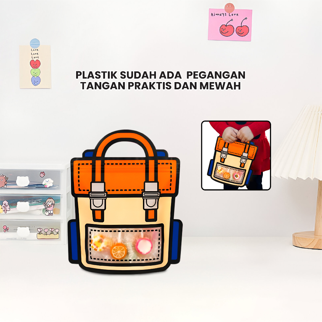 Plastik bingkisan dengan motif tas ransel bisa digunakan untuk menyimpan minuman kecil, snack, biskuit, kue kecil, cookies, permen. Plastik dilengkapi dengan segel kedap udara yang bisa dibuka tutup (ziplock). Plastik sudah ada pegangan tangan praktis dan mewah.