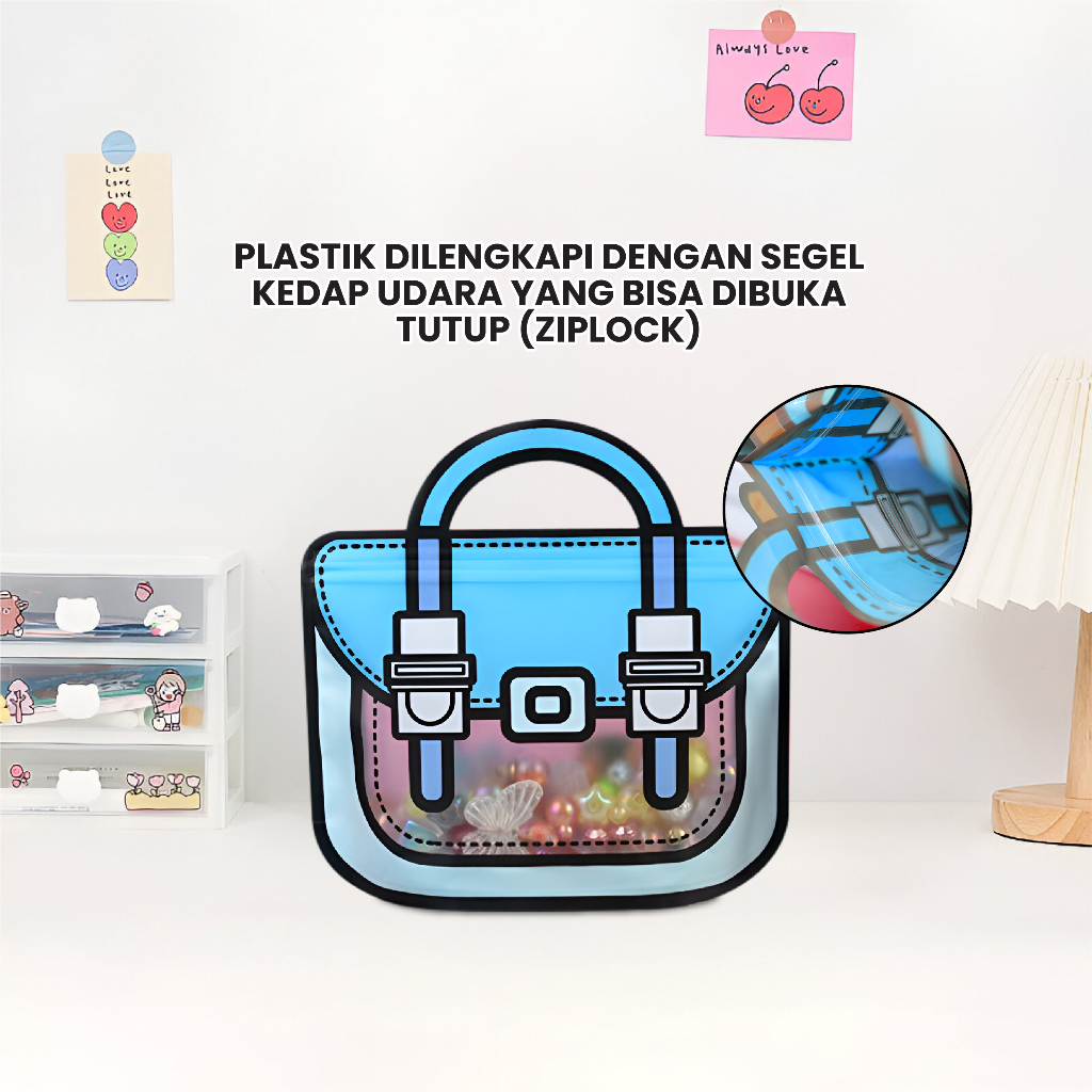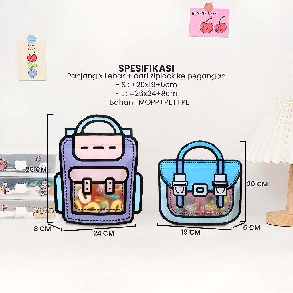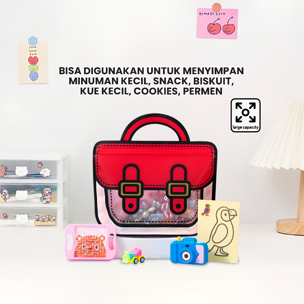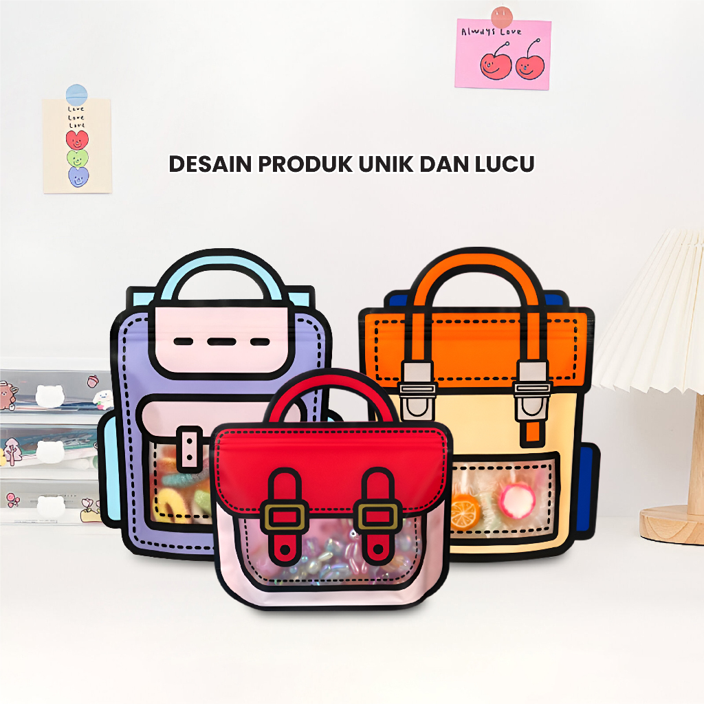 Plastik bingkisan dengan motif tas ransel bisa digunakan untuk menyimpan minuman kecil, snack, biskuit, kue kecil, cookies, permen. Plastik dilengkapi dengan segel kedap udara yang bisa dibuka tutup (ziplock). Plastik sudah ada pegangan tangan praktis dan mewah.