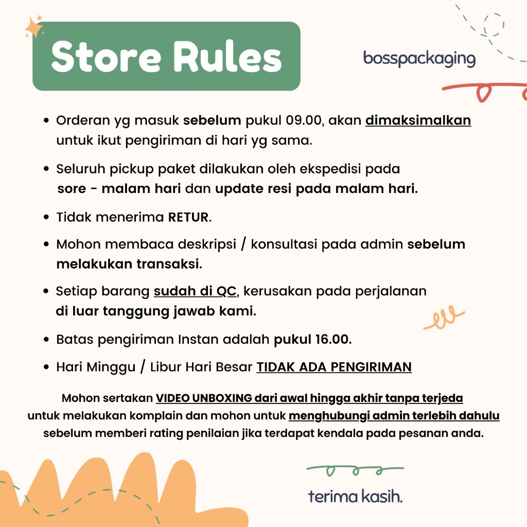 UNTUK PEMBELIAN PRODUK DISARANKAN MENGGUNAKAN TAMBAHAN PACKING GUNA KEAMANAN PRODUK, KERUSAKAN YANG DIAKIBATKAN OLEH PIHAK EKSPEDISI DILUAR TANGGUNG JAWAB KAMI, SEMUA PRODUK YANG KAMI KIRIM SUDAH MELALUI QUALITY CHECK.
