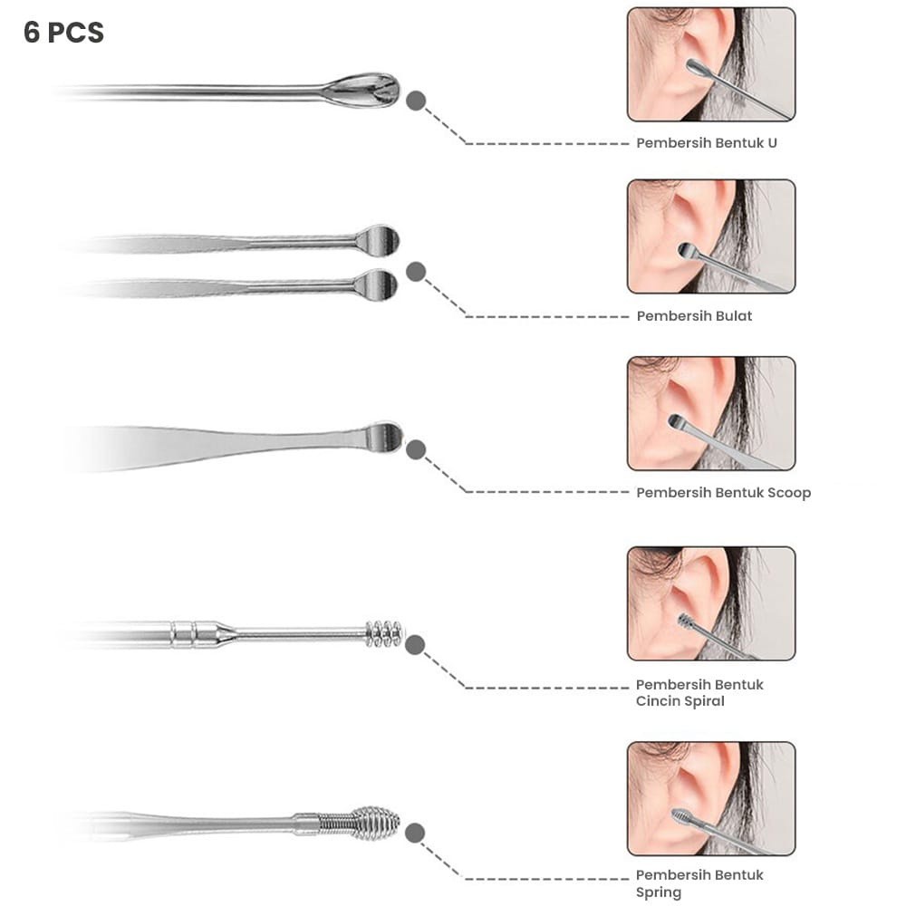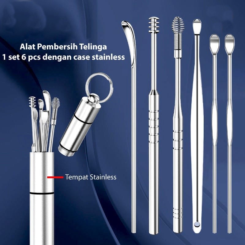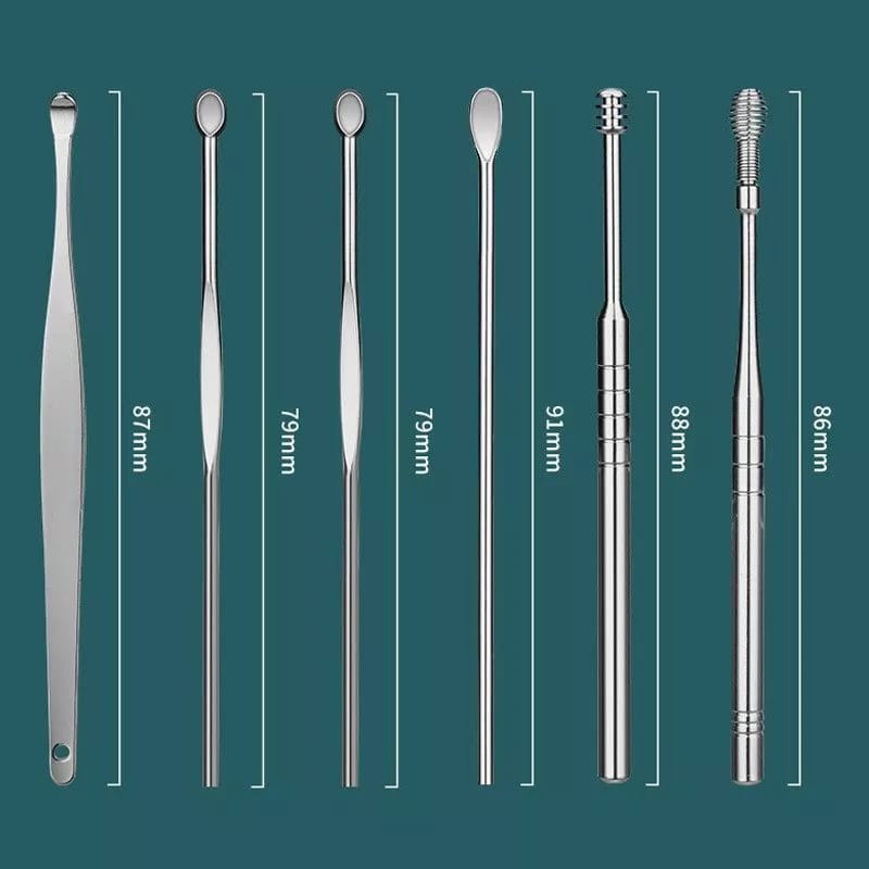 Satu set Pembersih telinga ini dapat memenuhi segala kebutuhan Anda dalam merawat dan membersihkan telinga Anda. Dengan bahan stainless steel, korekan kuping ini akan bisa tahan lama. Anda bisa dengan mudah memilih pembersih telinga yang mana yang cocok dengan telinga Anda karena ada 7 buah pembersih telinga dengan berbagai macam bentuknya. Dari kotoran telinga yang keras hingga yang lembek sekali pun bisa dibersihkan
