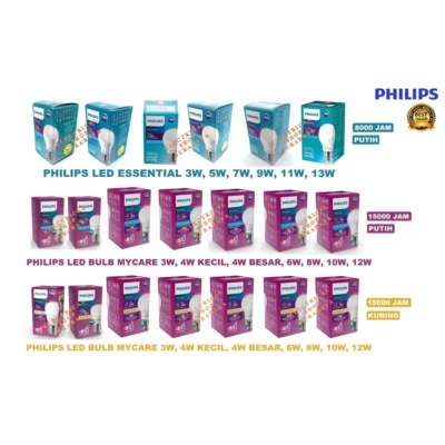 - Philips LED Essential Putih / Cool Daylight: 3W, 5W, 7W, 9W, 11W, 13W, 15W