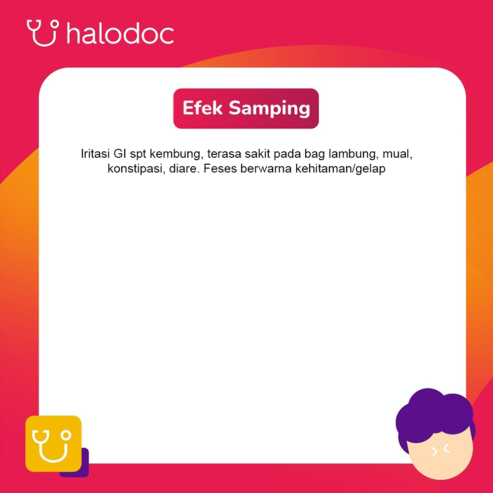 Iritasi GI spt kembung, terasa sakit pada bag lambung, mual, konstipasi, diare. Feses berwarna kehitaman/gelap