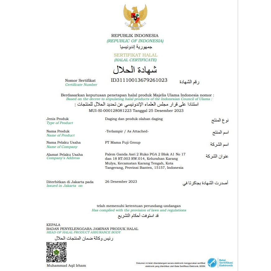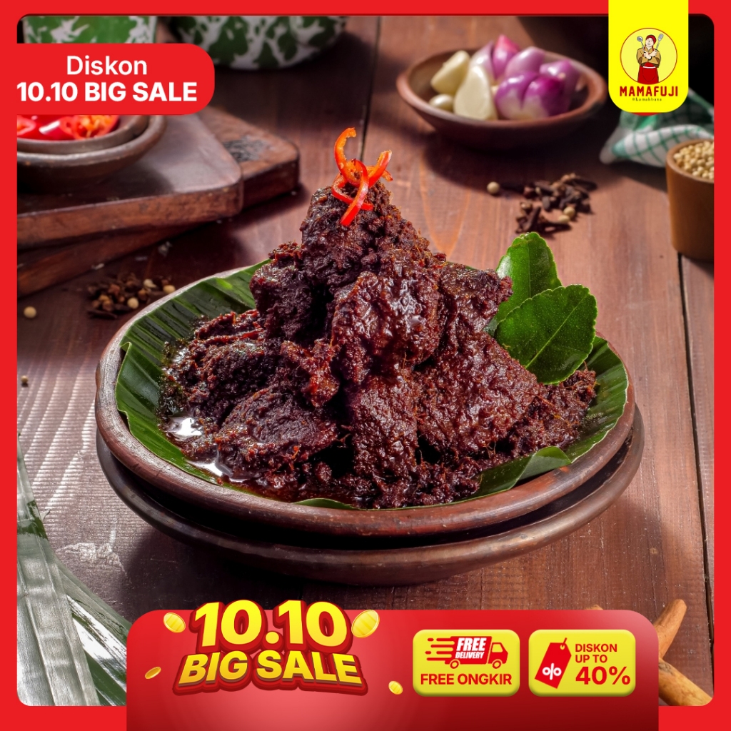 Rendang sapi yang menggunakan bumbu rempah-rempah pilihan dan resep rahasia mama fuji. Dimasak dengan waktu 8 Jam sehingga bumbu meresap sempurna kedalam daging , dan menjadikan daging sedikit alot, dengan ciri kas rendang padang yang sesungguhnya, Dengan porsi yang besar untuk satu keluarga, sangat nikmat disajikan dengan nasi hangat. Bumbu Rendang yang khas mama fuji berbeda dengan bumbu rendang lainnya.
