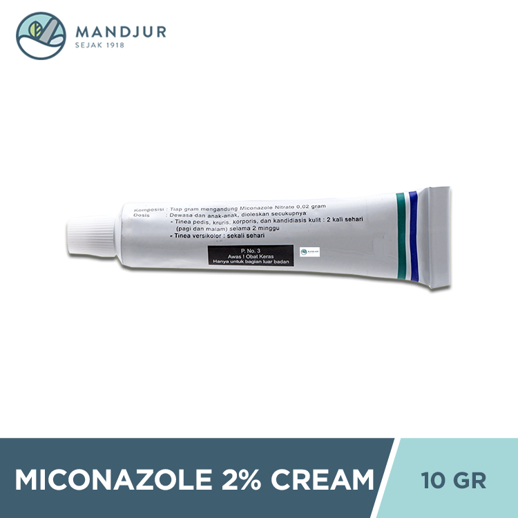 MICONAZOLE CREAM merupakan obat antijamur golongan imidazol yang mengandung miconazole. Krim ini digunakan secara topikal atau pada membran mukosa untuk mengobati infeksi yang disebabkan oleh fungi Trichophyton, Epidermophyton, Microsporum, Candida, dan Malessezia furfur. Miconazol bekerja menghambat biosintesis ergosterol pada jamur dan mengubah komposisi komponen lipid lain di dalam membran, sehingga mengakibatkan nekrosis sel jamur.