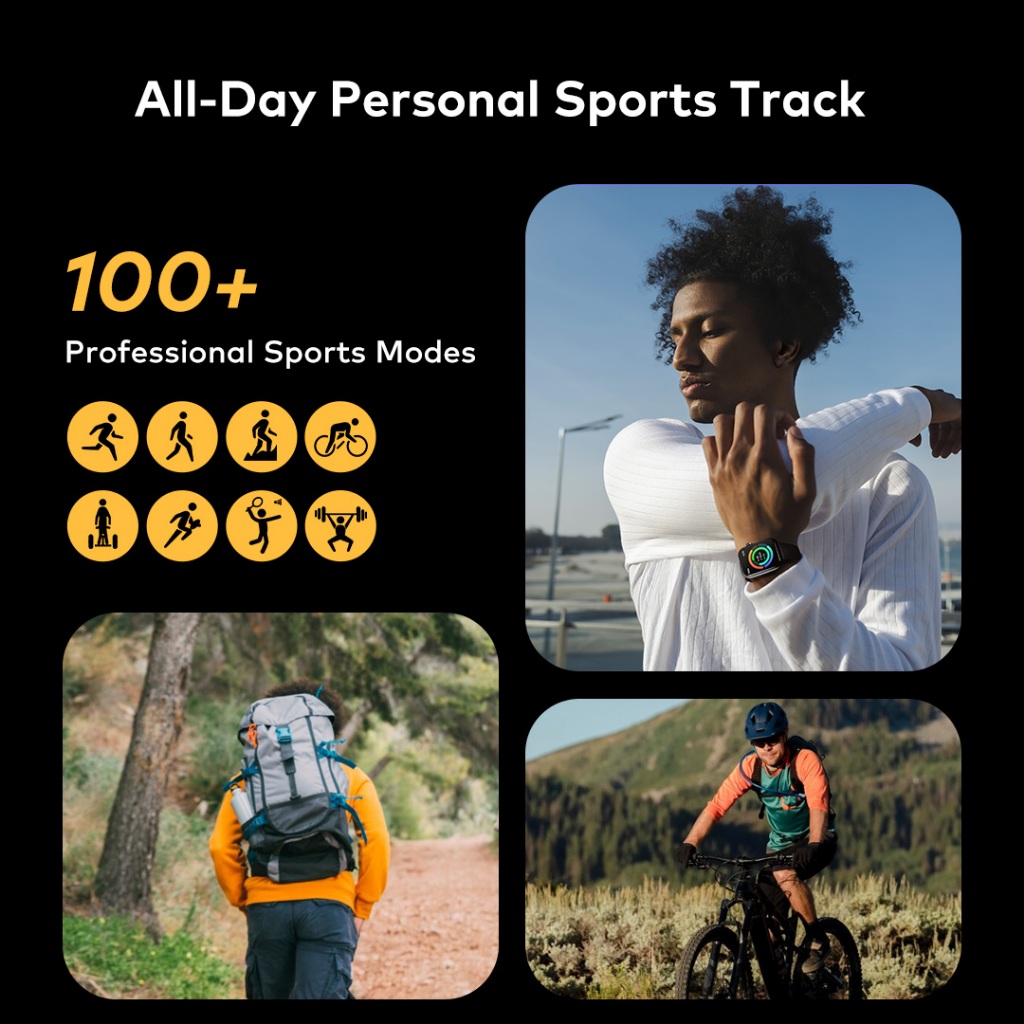 Fungsi lainnya: 50 mode Olahraga & Outdoor, Notifikasi pesan, Temukan ponsel, Kamera jarak jauh, Suara Al, Stopwatch, Panggilan BT Jernih, Siaga Total 15 Hari, Monitor Kesehatan Akurat, Kontrol Musik, Kontrol Kamera, Notifikasi Cerdas