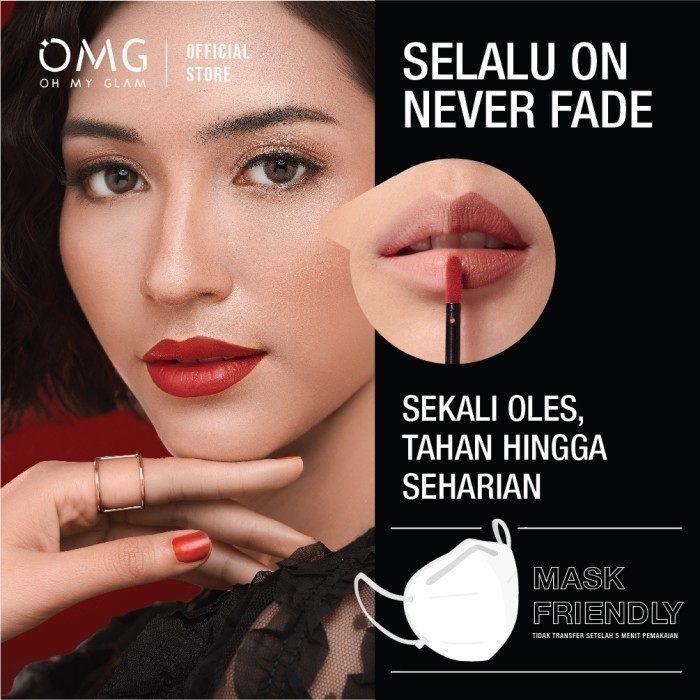 OMG Oh My Glam Matte Kiss Lip Cream Merupakan lip cream dengan warna intense dan memberikan hasil matte yang tahan lama sepanjang hari. Dilengkapi dengan 𝗩𝗶𝘁𝗮𝗺𝗶𝗻 𝗘 & 𝗝𝗼𝗷𝗼𝗯𝗮 𝗢𝗶𝗹 yang dapat menjaga kelembapan bibir dan melindungi bibir dari radikal bebas. 𝗧𝗿𝗮𝗻𝘀𝗳𝗲𝗿𝗽𝗿𝗼𝗼𝗳 dan 𝗺𝗮𝘀𝗸𝗽𝗿𝗼𝗼𝗳 dan Aman untuk bumil busui