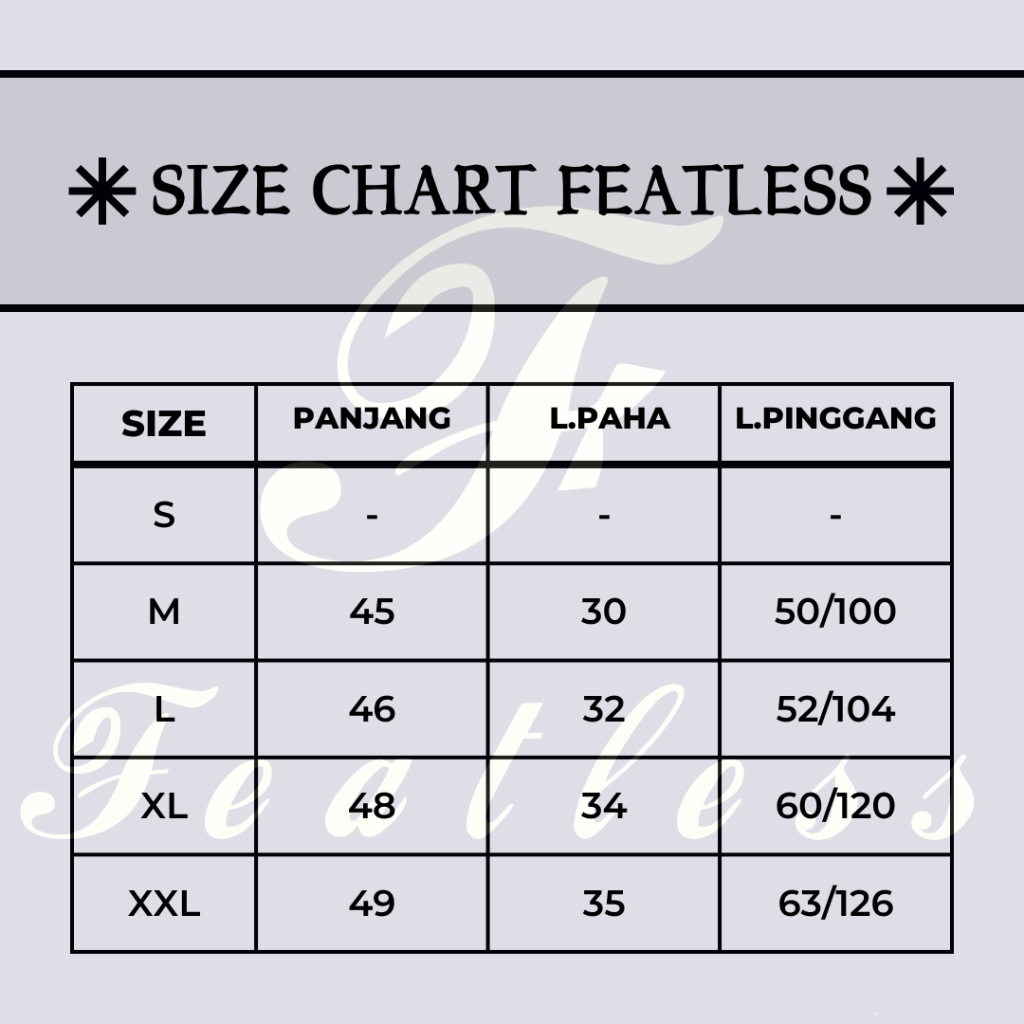 XL = panjang 48cm , lebar paha bawah 35 cm , pinggang 80-120 cm (melar + tali)