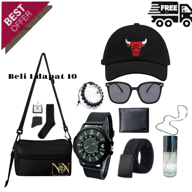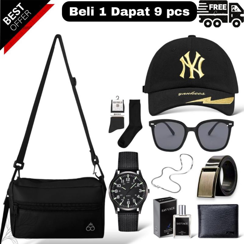 ( PAKET LENGKAP ) 6 IN 1 DAN 10 IN 1 TAS SELEMPANG PRIA SLING BAG PRIA GRATIS KACA MATA PRIA