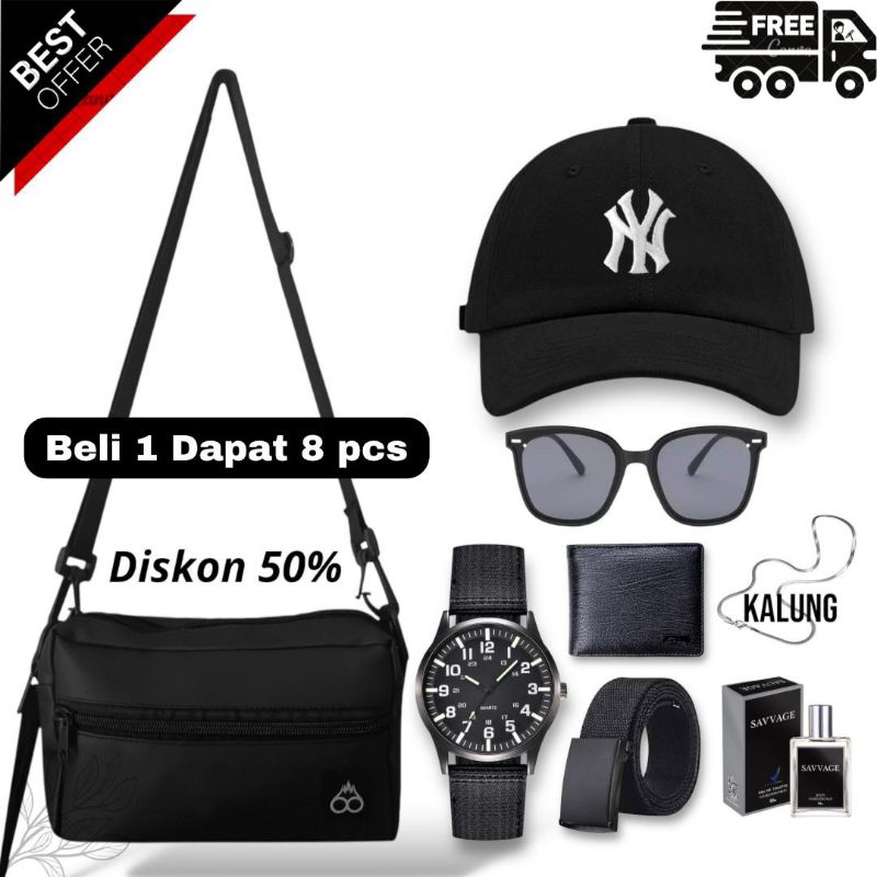 Beranda » Produk » ( PAKET LENGKAP ) 6 IN 1 DAN 10 IN 1 TAS SELEMPANG PRIA SLING BAG PRIA GRATIS KACA MATA PRIA