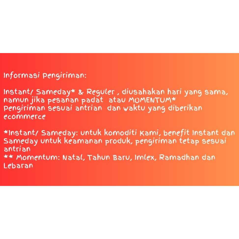 Setelah jam 12.00: Diusahakan Dikirim Hari dan Max H+1, Jika kebutuhan mendesak silahkan menegosiasikan ke admin melalui chat. (NAMUN JIKA MOMENTUM*, disesuaikan antrian dan kemampuan toko, mengikuti waktu yang diberikan ecommerce)