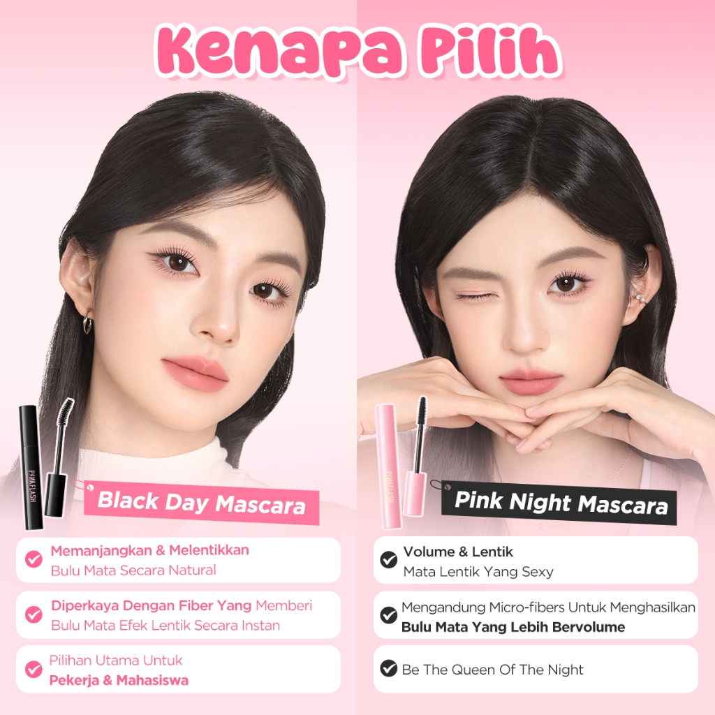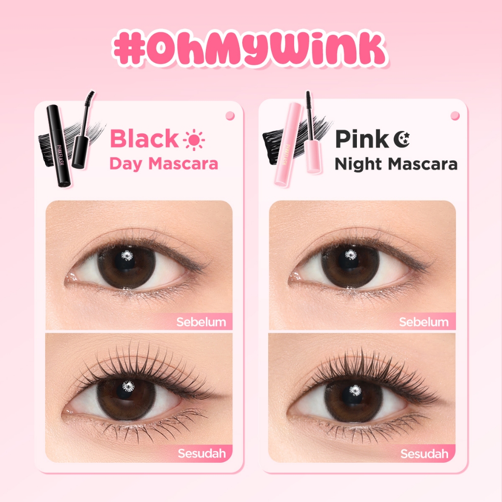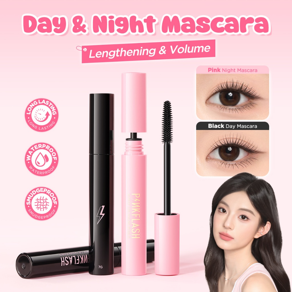 PINKFLASH Day & Night Mascara. Day Mascara menciptakan efek riasan alami yang lebih panjang dan ikal mikro (Cocok untuk pekerja kantoran dan pelajar).