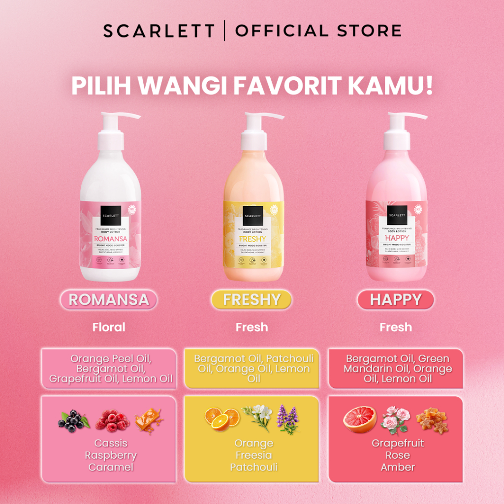 SCARLETT Fragrance Brightening Body Lotion Bright Mood Booster 300ml +4 Essential Oils 3X Brightening Power | Solusi Untuk Kulit Kering | Menenangkan, Mencerahkan Kulit, Wangi Tahan Seharian