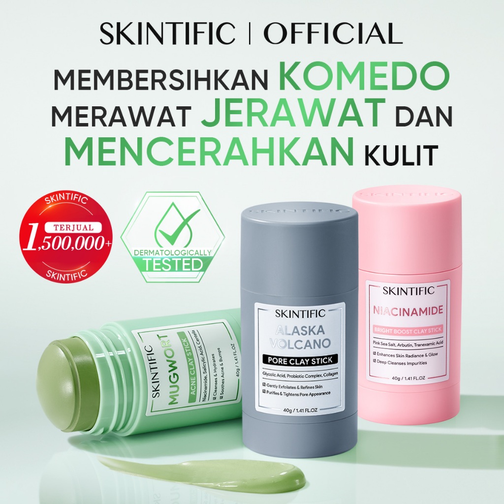 SKINTIFIC – Mugwort Acne Clay Stick + Alaska Clay Stick+Niacinamide stick| Clay Stick Combo Masker muka Wajah Komedo Acner Eksfoliasi Wajah Glowing Kecantikan Skincare Niacinamide Salicylic Acid Ceramide Centella Glycolic Acid Probiotic Complex