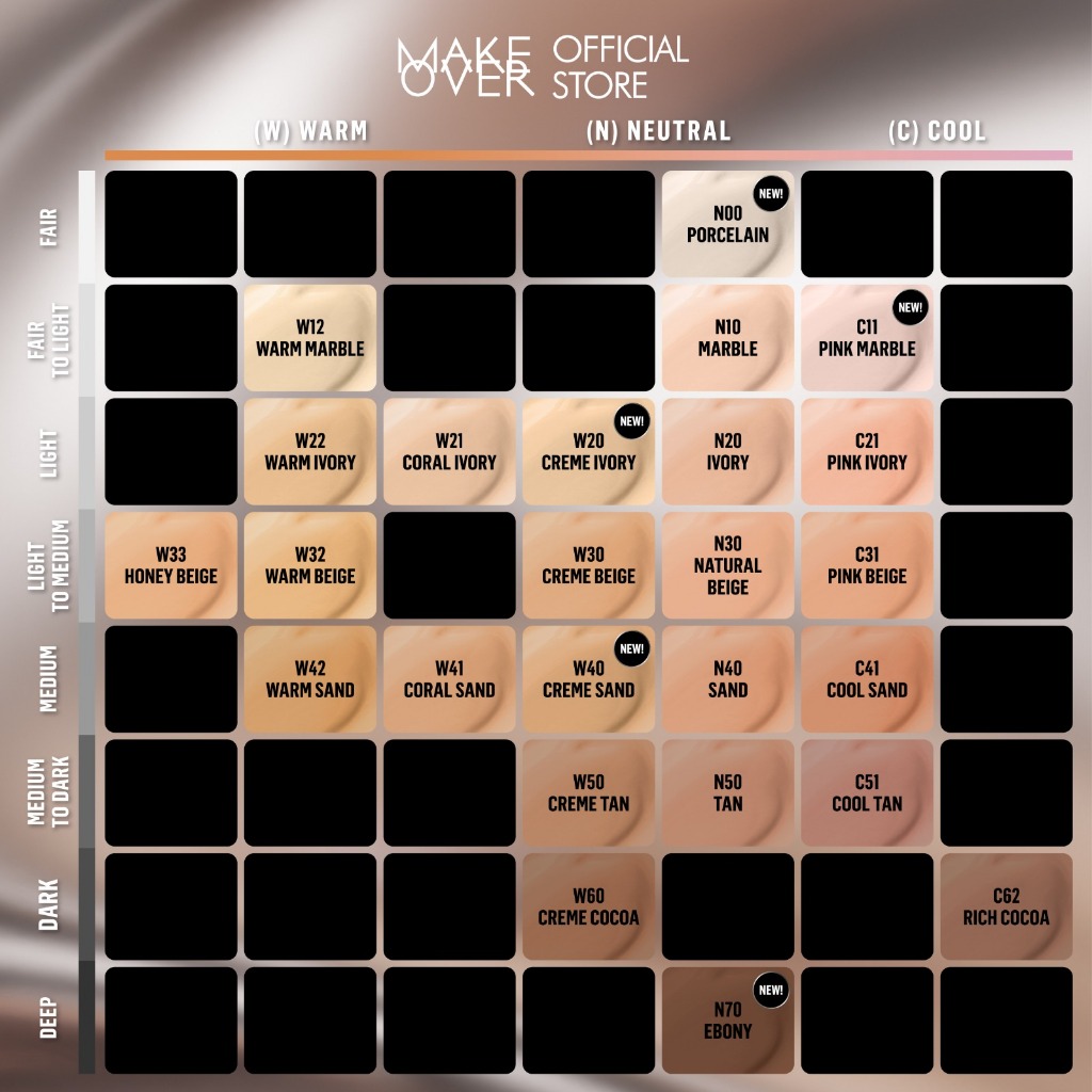 Menawarkan 25 pilihan shades dengan pilihan tingkat kecerahan yang lengkap untuk kecocokan yang tepat (menyediakan seluruh spektrum warna, dari yang paling terang-Porcelain hingga paling gelap-Ebony, serta dengan undertones yang warm-neutral-cool termasuk unique undertones).