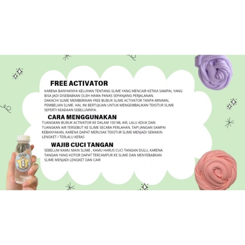 Dan kami sama sekali gak asal dalam melayani customer. Kami memberikan slime activator GRATIS, sebagai bukti bahwa kami peduli terhadap keadaan slime ketika sampai disana... Slime activator berfungsi memadatkan slime. Jadi kalo slime kalian melembek karena perjalanan lama.. bisa lebih aman