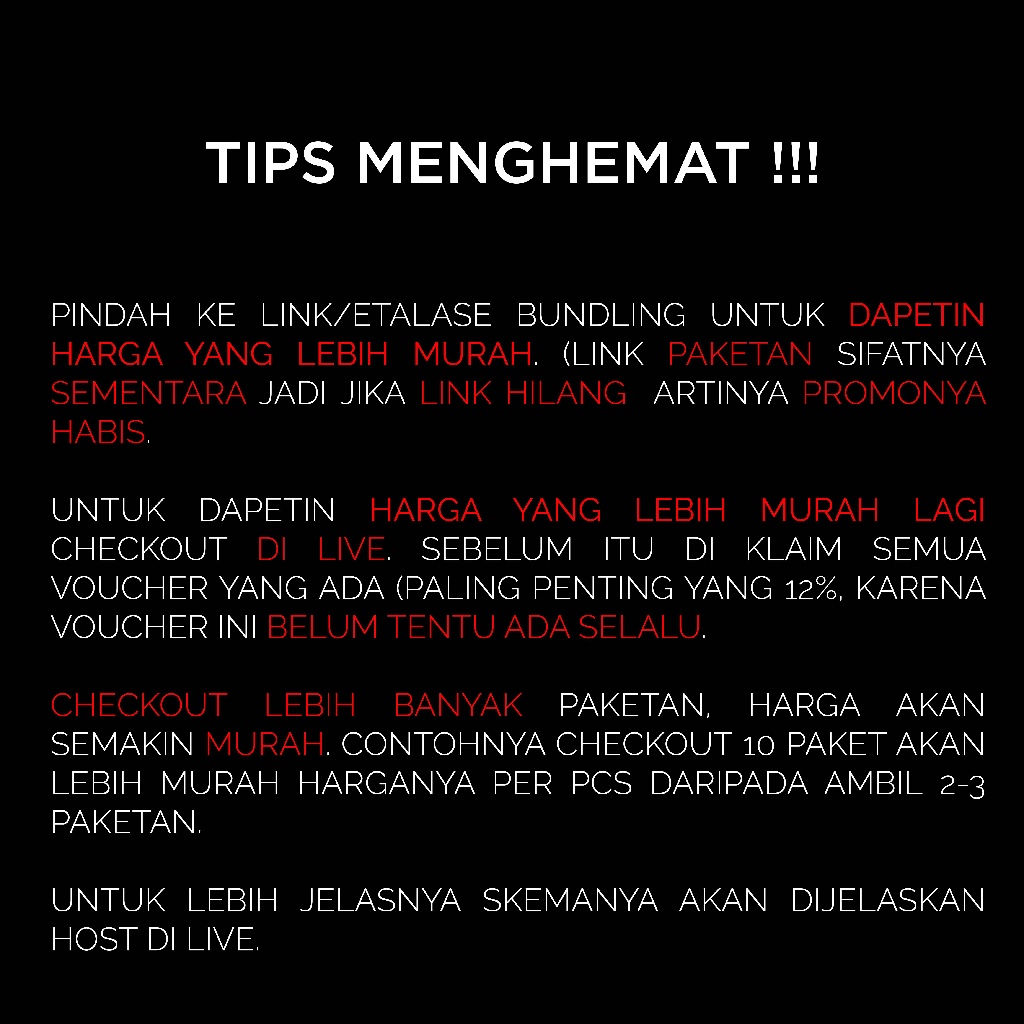PINDAH KE LINK/ETALASE BUNDLING (YANG JUDULNYA 4 PCS LEBIH HEMAT DAN 6 PCS LEBIH HEMAT)UNTUK DAPETIN HARGA YANG LEBIH MURAH. (LINK PAKETAN SIFATNYA SEMENTARA JADI JIKA LINK HILANG ARTINYA PROMONYA HABIS.