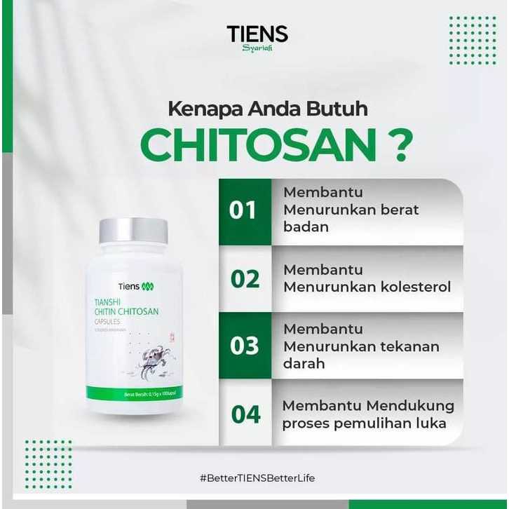 Suplemen Chitin Chitosan Tiens adalah produk kesehatan berbahan dasar chitosan, sejenis serat alami yang diekstrak dari cangkang hewan laut seperti udang dan kepiting. Suplemen ini dikenal memiliki berbagai manfaat untuk kesehatan, terutama dalam menangani masalah asam lambung, maag, gerd, gangguan pencernaan, luka diabetes, serta mendukung program diet.