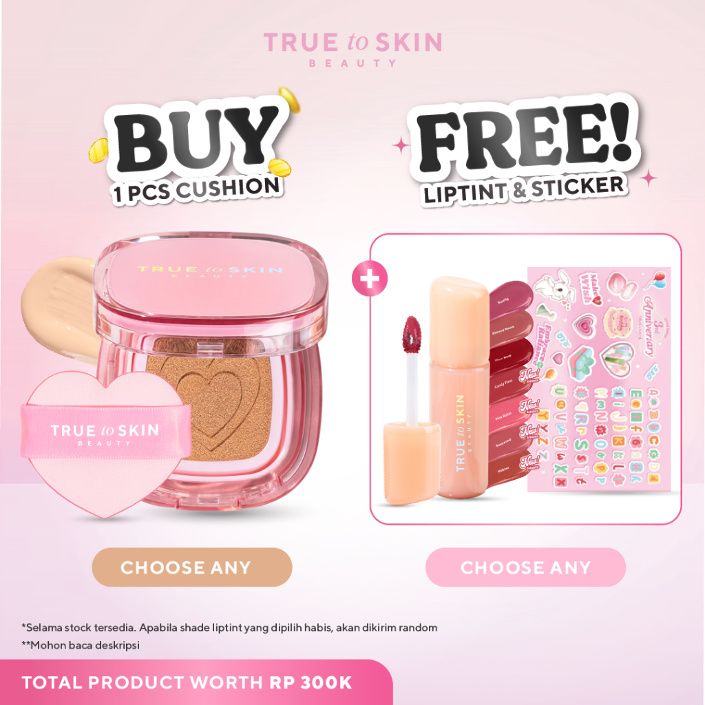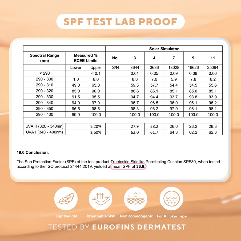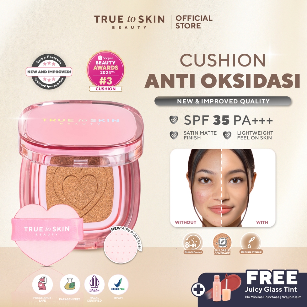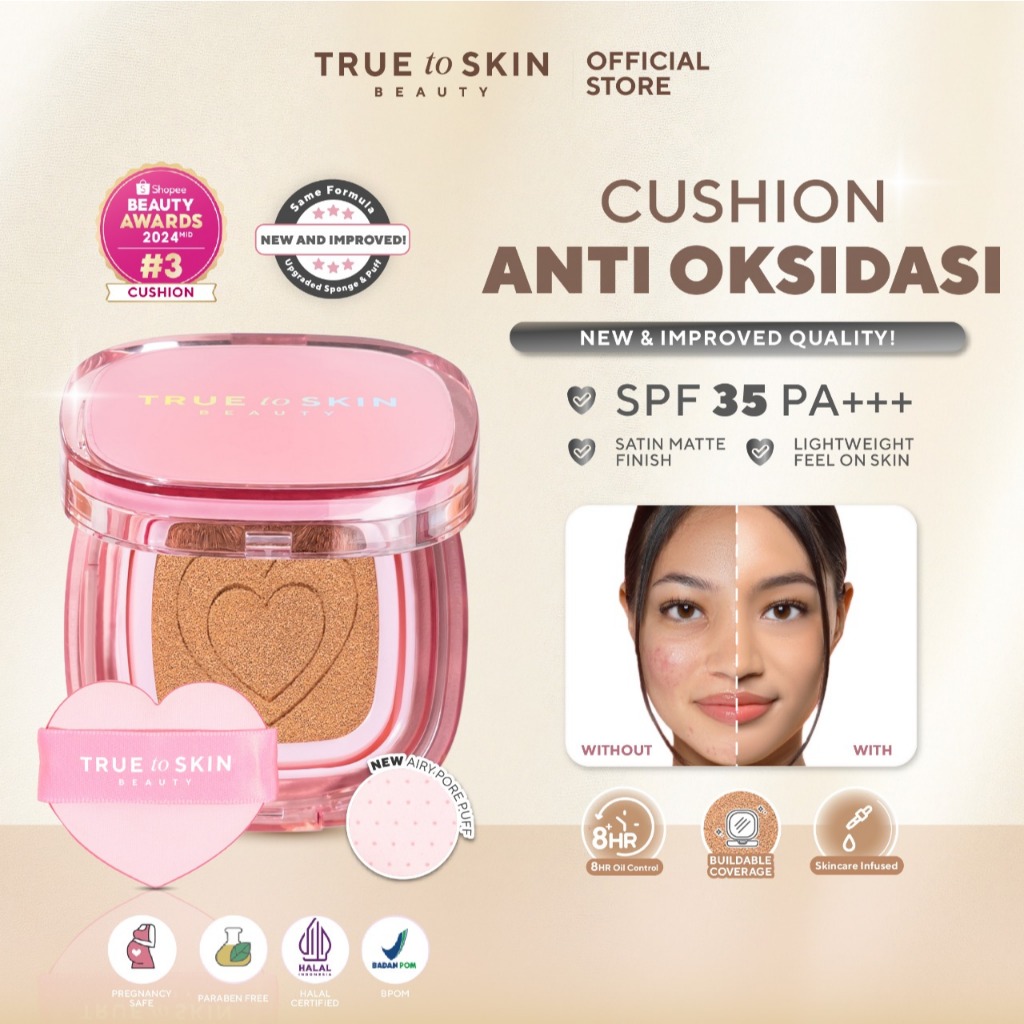 True to Skin – Skinlike Porefecting Cushion SPF 35 PA++++ Medium to High Coverage Satin Matte Finish Lightweight Tidak menyumbat pori pori
