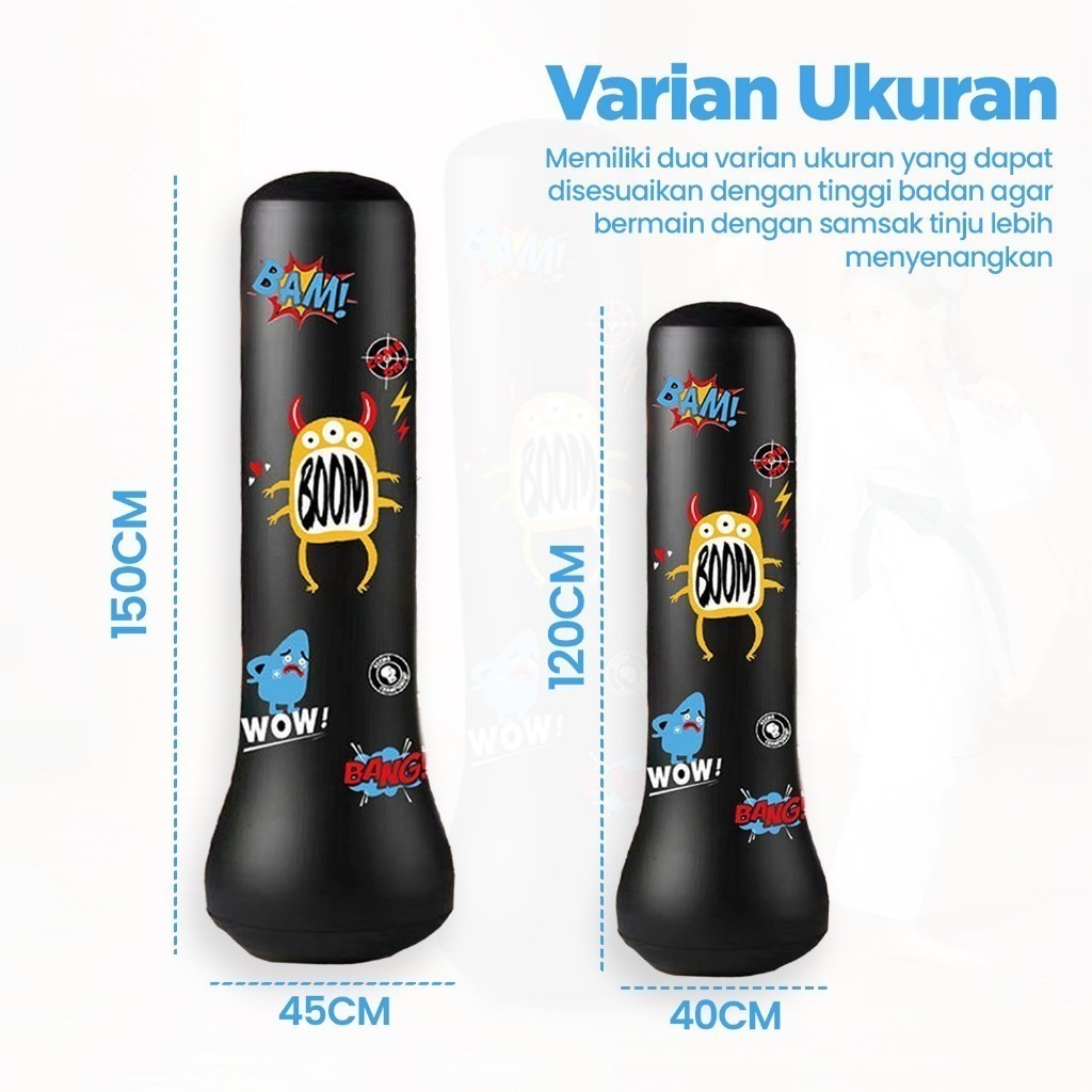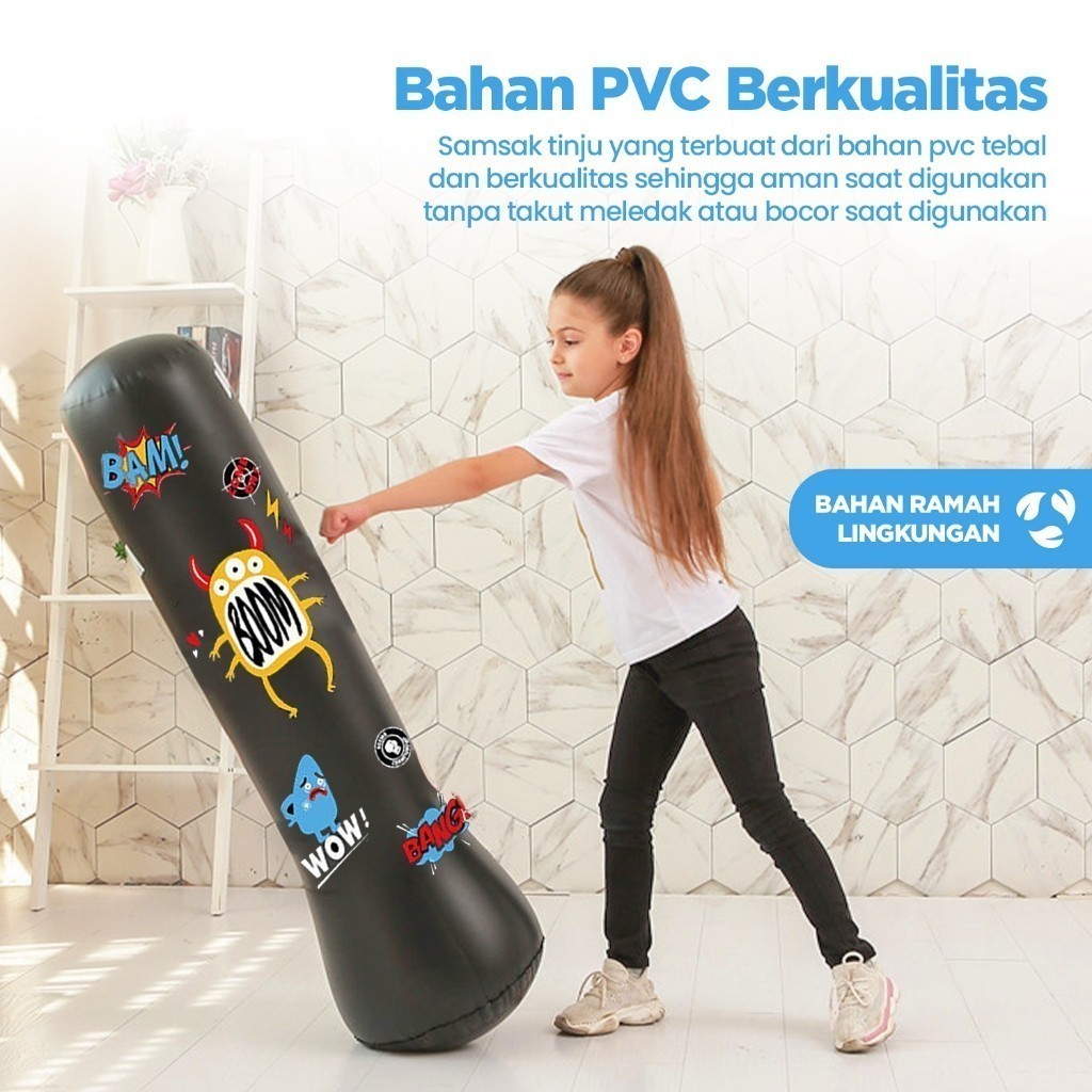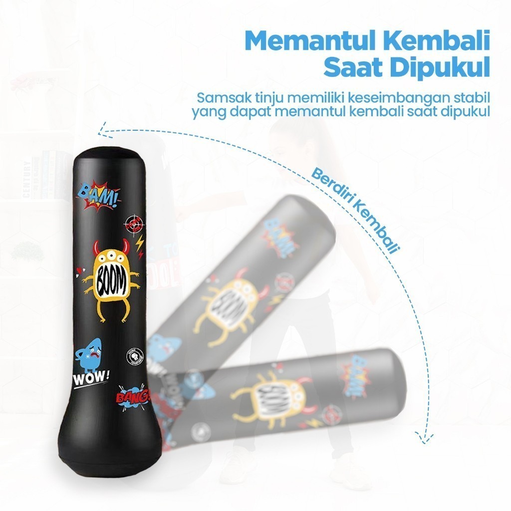 Stand Boxing Anak / Samsak Angin adalah struktur yang dirancang khusus untuk memfasilitasi latihan tinju bagi anak-anak. Stand samsak ini terbuat dari bahan PVC Tebal yang ringan dan aman, dengan ketinggian dan ukuran yang sesuai untuk anak-anak. Tujuannya adalah membantu anak-anak mengembangkan keterampilan tinju, keseimbangan, dan kebugaran fisik dengan cara yang aman dan terkendali.