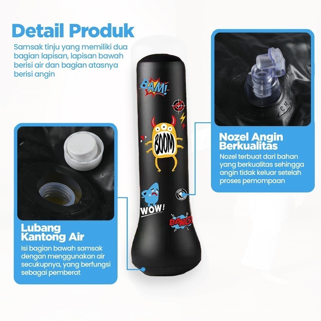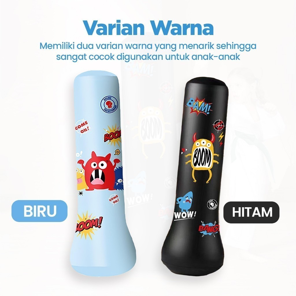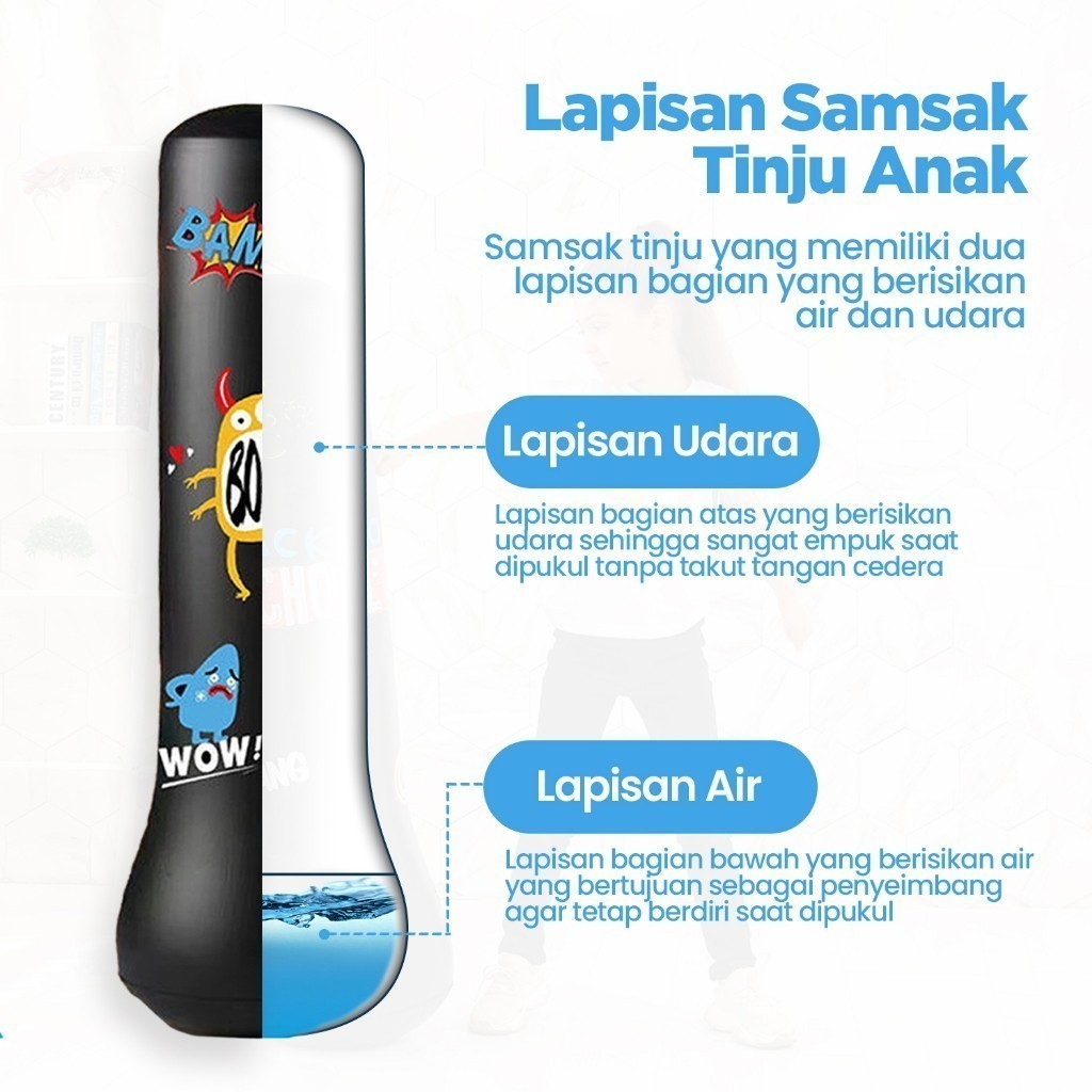 Stand Boxing Anak / Samsak Angin adalah struktur yang dirancang khusus untuk memfasilitasi latihan tinju bagi anak-anak. Stand samsak ini terbuat dari bahan PVC Tebal yang ringan dan aman, dengan ketinggian dan ukuran yang sesuai untuk anak-anak. Tujuannya adalah membantu anak-anak mengembangkan keterampilan tinju, keseimbangan, dan kebugaran fisik dengan cara yang aman dan terkendali.