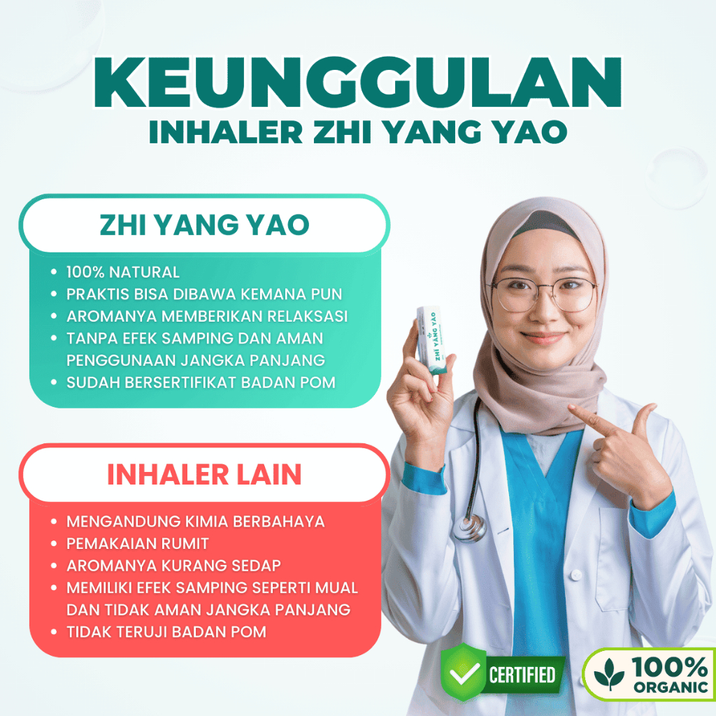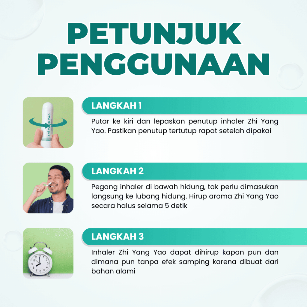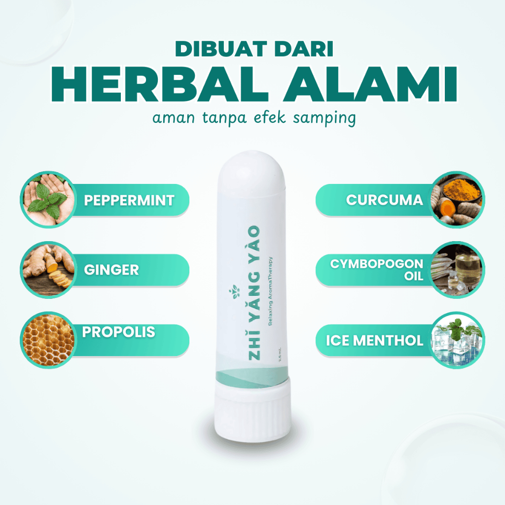 Zhi Yang Yao Inhaler tidak hanya membantu meredakan masalah pernapasan dan penyakit pernapasan kronis, tetapi juga mampu meningkatkan suasana hati dan meredakan gejala gangguan kesehatan mental dengan kandungan extra dari Ginger, Propolis dan Kurkuma.