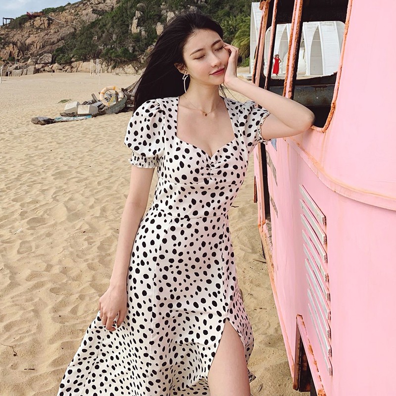 Newlan Qz004 Baju Pantai Wanita Dress Midi – Length Split Polkadot